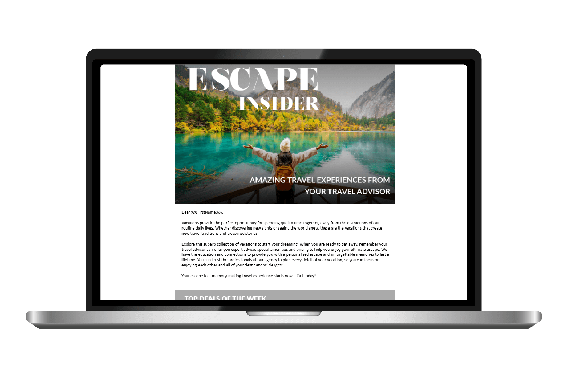 Escape Insider is Nexion Travel Group’s multi-supplier, tactical consumer email that is sent by Nexion Travel Group on a monthly basis on behalf of members who are part of the ENGAGEMENT MARKETING PROGRAM. This is FREE marketing that is part of your Nexion Travel Group membership!
