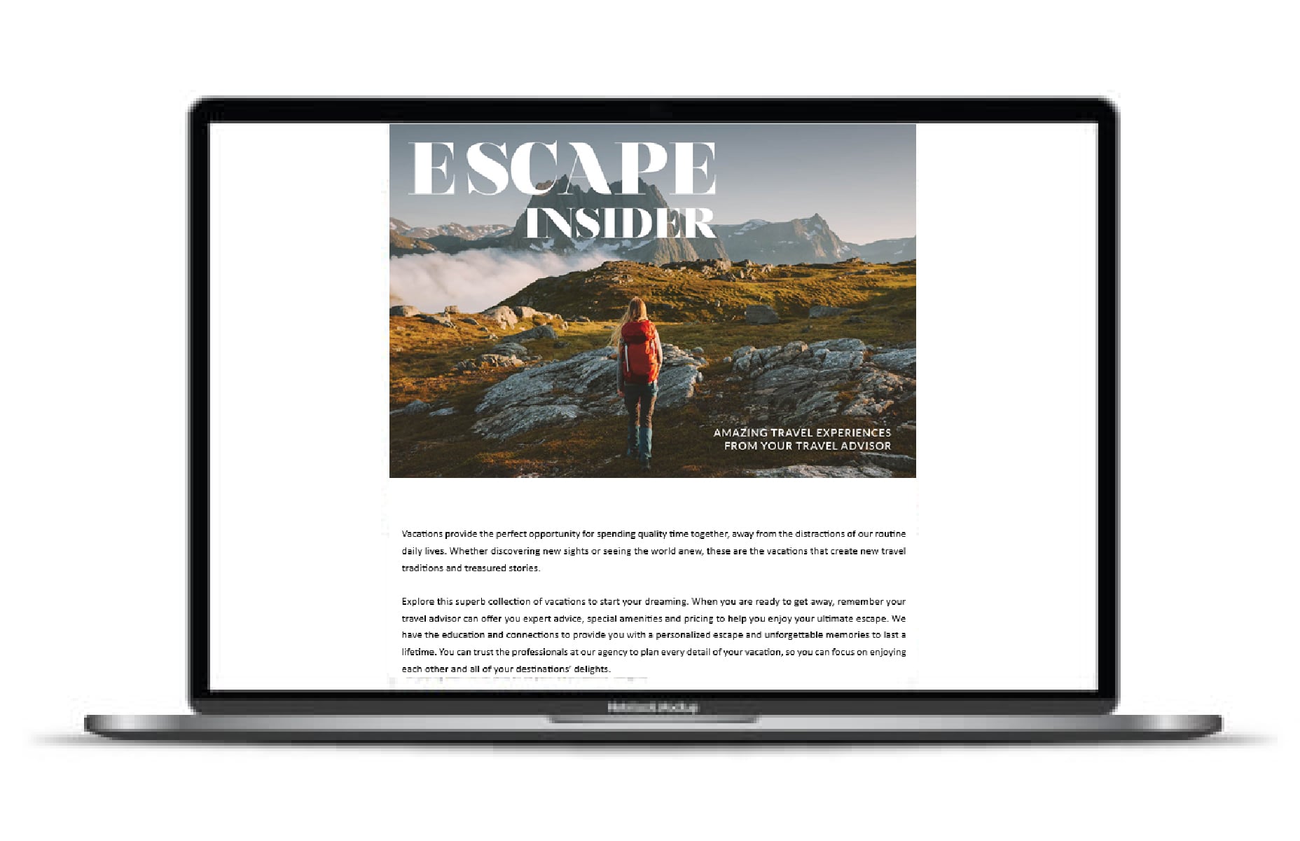 Escape Insider is Nexion Travel Group’s multi-supplier, tactical consumer email that is sent by Nexion Travel Group on a monthly basis on behalf of members who are part of the ENGAGEMENT MARKETING PROGRAM. This is FREE marketing that is part of your Nexion Travel Group membership!