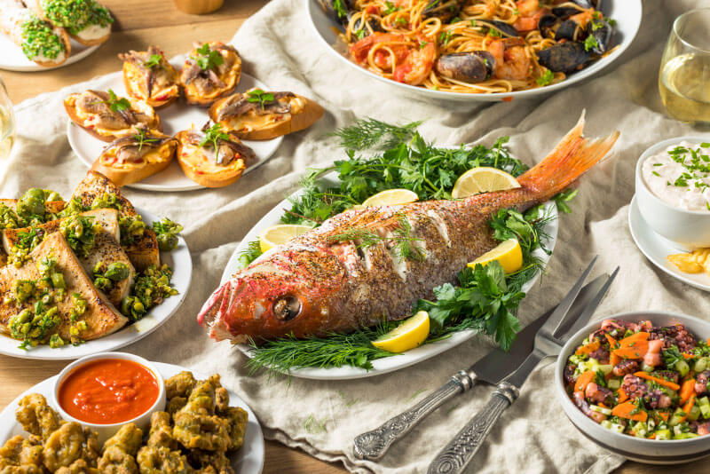 The Feast of the Seven Fishes is a Christmas Eve tradition for many Italians and Italian-Americans. The time-honored seafood and shellfish feast typically has seven different dishes, representing the seven days God took to create the universe. Or some like to cook twelve dishes of fish, to represent the twelve apostles.