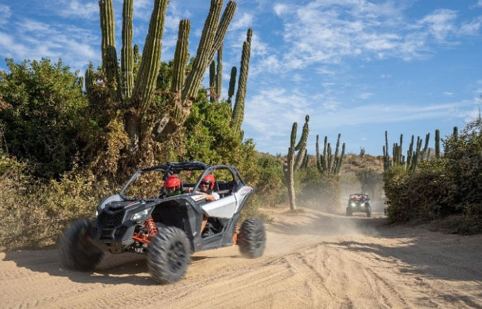 Discover the excitement of a Can-Am X3 Turbo in Los Cabos, where huge dunes and stunning Pacific Ocean views await. Go from 0 to 100 km/hr. in less than 4.5 seconds aboard a heavily equipped Can-Am Maverick X3 Turbocharged vehicle as you skim over the sands of the Baja desert.
