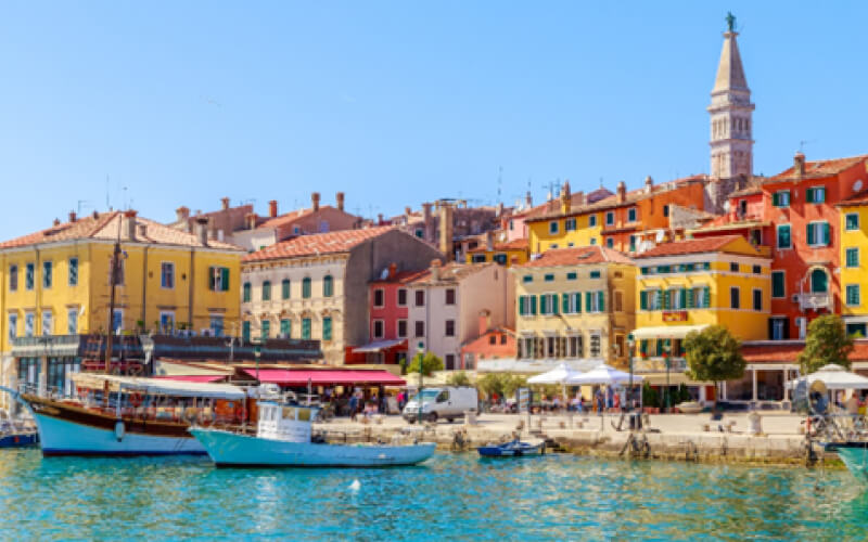 It’s easy to discover the charms of Rovinj on foot – the Old Town is brimming with historical buildings in gothic, Renaissance, and baroque styles all linked by narrow cobbled streets. Head to Grisia Street, a bustling pedestrian street lined with limestone buildings where you can shop for coral jewelry, handicrafts, leather goods, and Teranino, a favorite Istrian red wine liqueur.
