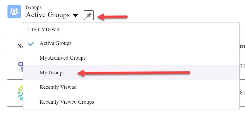 4. Easily access the groups you belong to by Pinning them. Click on Groups, then click on the drop arrow next to Active Groups. Click on My Groups, then click on the push pin icon.